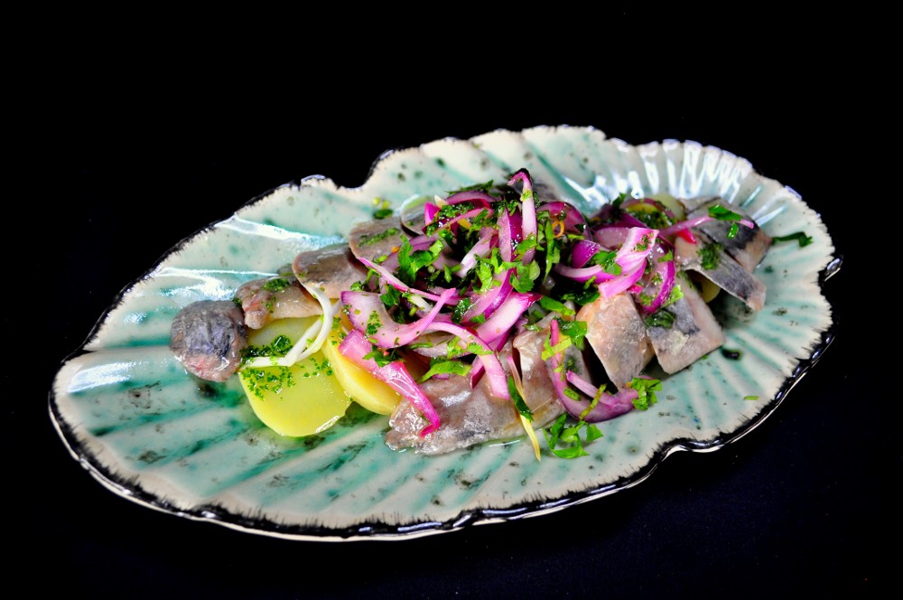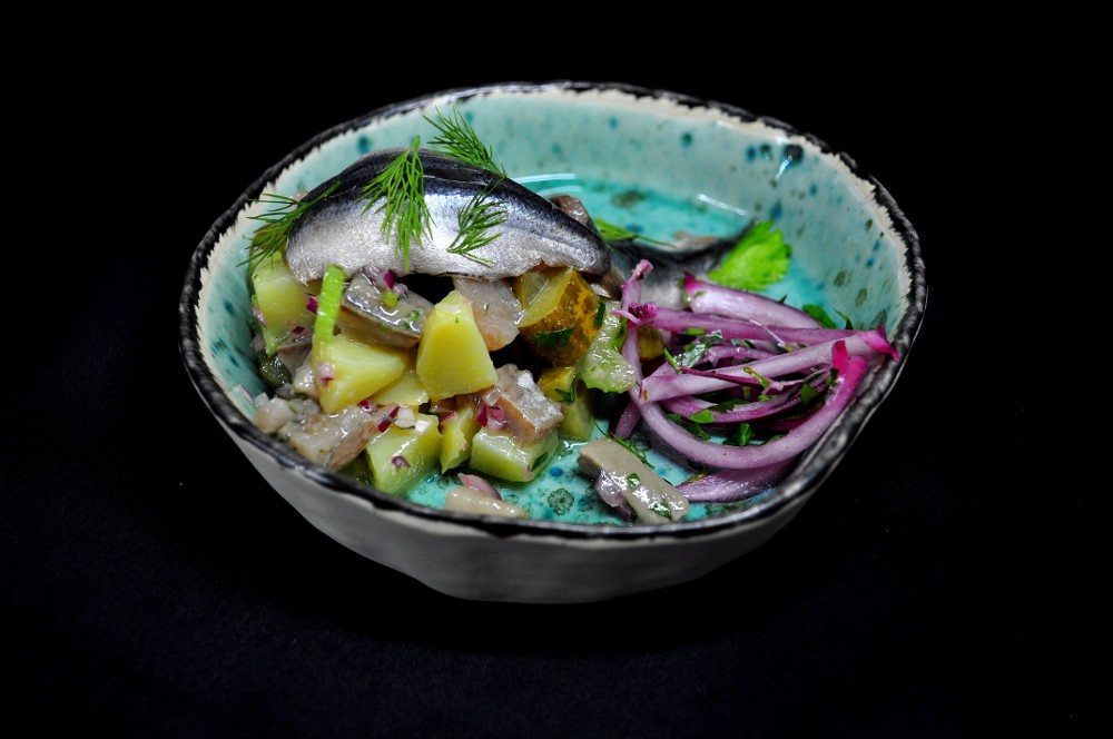 Оселедець на картопляній подушці з маринованою цибулею