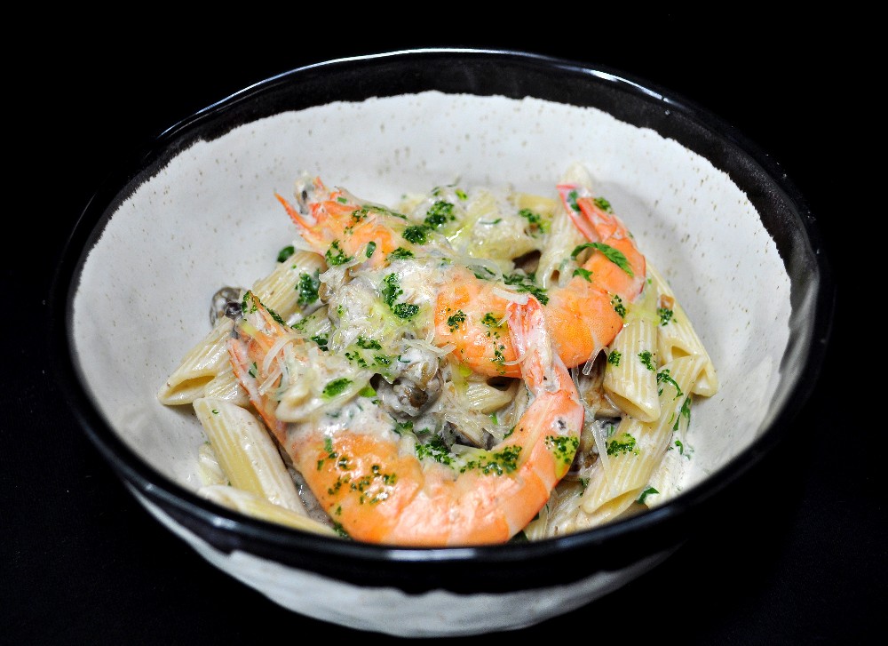 Паста з креветками, білими грибами та равликами