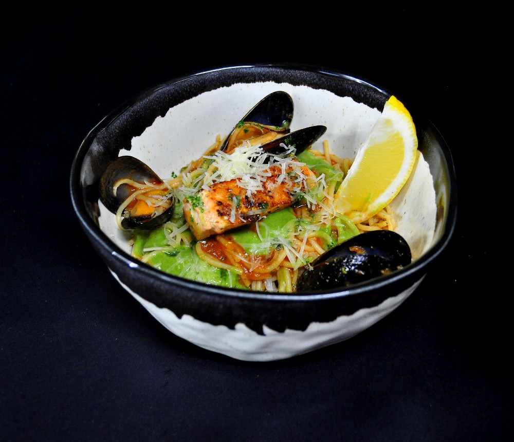 Паста з лососем та мідіями в соусі маринара